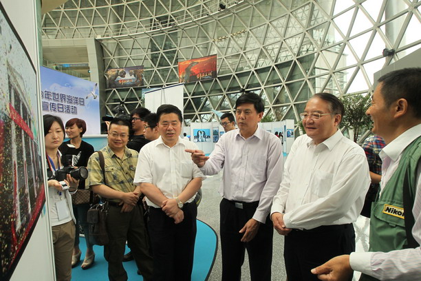 潘迎捷校长与上海海洋局副局长朱石清为《美丽的海洋》摄影作品展揭幕