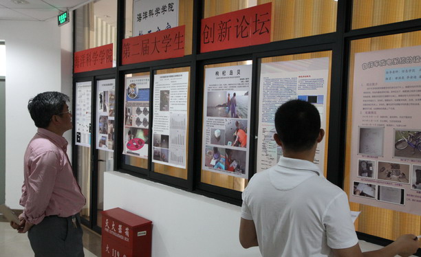 上海海洋大学海洋科学学院于5月28日12:00-16:00在学院一楼教工之家举行了大学生创新论坛,教务处副处长张帆老师、海洋科学学院党委书记许四杰老师及四位专家评委印春生、李云凯、张新峰、魏永亮参加了此次创新论坛。本次论坛旨在为参与大学生创新项目活动的同学们提供一个研究交流的平台,让尚在本科阶段学习的同学们了解学术论坛的开展模式,同时进行海洋科学学院2013年大学生创新项目的中期检查工作。在论坛交流中,专家们评审了学生项目已完成部分的情况,对同学们项目下一步进展抒发己见,帮助同学们更有效地把握准研究方向,运用合理的科学方法解决研究中存在的瓶颈问题。