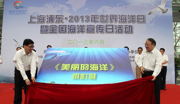 潘迎捷校长与上海海洋局副局长朱石清为《美丽的海洋》摄影作品展揭幕