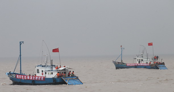 6月8日是世界海洋日,也是全国海洋宣传日。6月9日上午,上海市海洋环境监测预报中心在芦潮港启动首次贝类规模性投放,两艘捕鱼船将向近海投放5吨贝壳。一个月内,近5000万只、总计200吨贝壳将在上海近岸7.5平方公里海域内进行投放,这是上海首次实施规模性贝类投放,旨在修复海底生态系统,恢复海底生物多样性。上海市海洋局杨健、沈依云、朱石清副局长以及我校黄硕琳副校长出席活动。