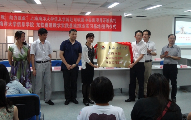仪式上,黄冬梅院长与孙延建总监还共同为“信息学院教学实践基地(就业实习基地)”签约揭牌,这也标志着我院与东软集团在今后教学、科研、学生就业、师资培训等多方面会有更多的合作机会与平台,而这些机会的到来和平台的搭建,其最终受益者也一定是我们海大的信息学子们。会后,黄院长、各系主任一行还专门视察了学生的实训教室、实训环境、食堂与学生宿舍。