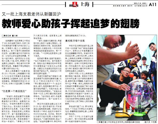 据悉,7月8日《新闻晨报》A11版专题报道了上海支教老师的新闻,其中“高校教师喀什支教”一栏专门报道了和提到了我校焦老师的感人故事。