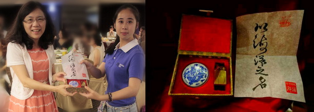 15名上海海洋大学同学共同篆刻“海洋”凝聚友谊的印章在闭幕式中赠送给台海大蔡副校长