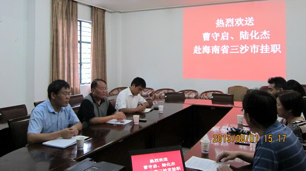 汪之和部长介绍了三沙市的概括和两位老师赴三沙市挂职的基本情况,我校是第一个与三沙市签订合作共建的海洋类高校,曹守启副院长挂职三沙市经济发展局局长助理、陆化杰博士挂职综合执法局局长助理。他们分别介绍了挂职前与三沙市联系的情况和挂职打算,有决心和信心做好这次挂职工作。学院和职能部门领导均表示会克服困难、全力支持他们的工作。潘校长对这次挂职工作很重视,并从三个方面提出了希望,首先,要求尽快进入政府工作角色,熟悉发展定位,了解工作流程、掌握发展动态。其次,要从国家南海发展战略角度谋划和设计工作计划,根据我校特色做好渔业资源调查、研究和利用工作,第三,要合理安排好学习、工作和生活,真正融入到三沙市的发展中,学校一定会全力予以支持。
