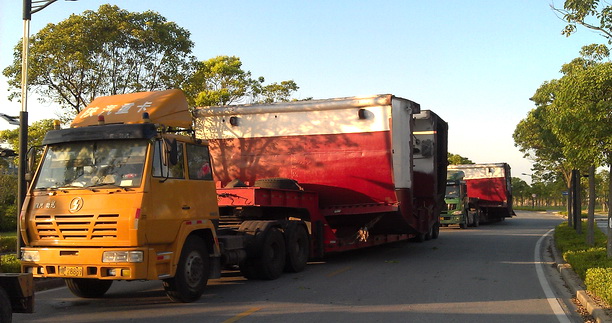 7月23日,船体运达学校第一天。为了将船体运输对校园师生生活的影响降到最低,经讨论决定船体运输安排在凌晨进行。凌晨5点,基建处、保卫处、紫泰物业等部门已就位,为道路铺设钢板、封路、安排运输车辆进校,考虑到构件体积较大可能会对沿路树木绿化造成影响,后勤处也安排了绿化养护部门随行,对破损的树木第一时间进行修复。由于前期准备充分,船体顺利到达学校指定地点。早上10点吊装工作正式开始,此时已是艳阳高照,骄阳似火,汗水也早已渗透了大家的衣衫,可为了能按时按点完成吊装工作,为第二天的船体构件就位提供条件,有人甚至连一口水都顾不上喝,埋头苦干着。硕大的汗水一滴一滴掉在地上,但是看着吊装工作紧条有序,大家还是流露出一丝欣慰的笑容。