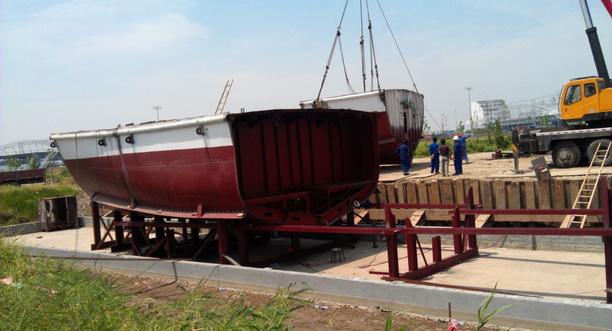 渔政206船长41米,宽7.2米,重达300多吨。经学校研究决定,将其安置在学校水上活动中心南侧芦潮引河边,建成后计划作为教学实验及展示使用。由于船体巨大,无法整体进校,经过多轮方案商讨论证后,学校决定将该船进行分割后到校再行组装。为了不影响拼装效果,分割后的构件仍重达40多吨。为确保船体构件在校园运输过程中万无一失,基建处、保卫处、后勤处及紫泰物业、构件运输公司等相关部门、单位对校园运输路线进行反复考察和讨论,最终制定了一套详细的保障方案。