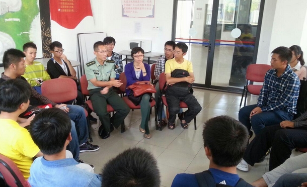 面对大一新生,张杰笑容满面,热情大方,步伐矫健,充分展现了当代军人的风采。张杰首先回忆了自己在海大时的美好生活,感谢海大的老师对他生活和学习上的关心和严格要求。并跟在座的学弟学妹们强调“现在要为自己做好定位,让大学充实起来,这样才不会后悔。”座谈中,男生们对张杰参军入伍的初衷、部队的管理制度、紧张的军营生活等情况有着浓厚的兴趣和好奇心,一个个问题接踵而至。令在座同学印象特别深的是张杰的一句话,“参军入伍,可能开始你是想获得一些有形的东西,但后来你会发现,你所获得的那些无形的东西才是无价之宝。”张杰感觉参军入伍不仅锻炼了自己的体力、思维,提高了自信、责任,懂得了战友情,更深刻理解并践行着理想、信念和使命。