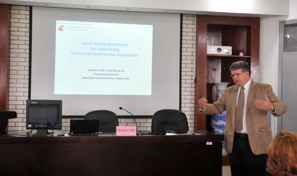 2013年10月18日,由Nancy Magnuson副校长率领的美国华盛顿州立大学代表团一行四人来我校食品学院交流访问,食品学院王锡昌院长、常务副院长王易芬教授等老师接待访问团。访问团Herbert Hill教授为师生带来题为“Novel Analytical Methods for Determining Contamination and Compositions”的讲座。