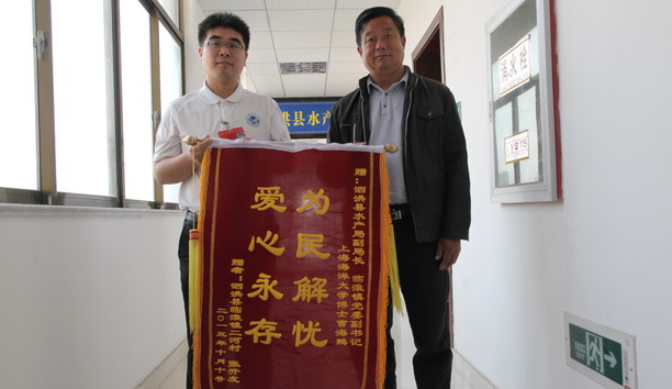 10月11日上午,江苏泗洪县临淮镇蟹农张开友将一面绣有“为民解忧、爱心永存”的锦旗送到了我校在泗洪县挂职水产局副局长、临淮镇党委副书记的曹海鹏博士手中,表达了水产养殖户对曹海鹏博士利用精湛技术为民解忧的感激之情。