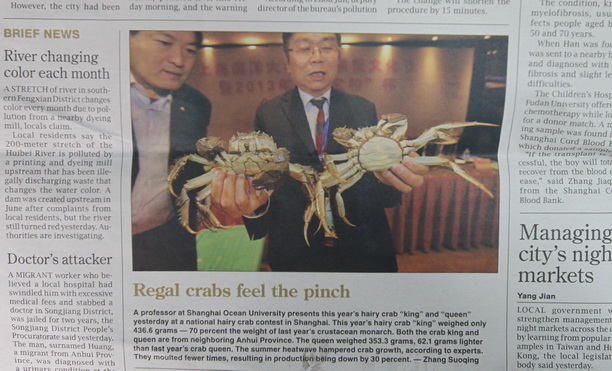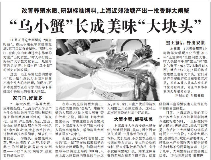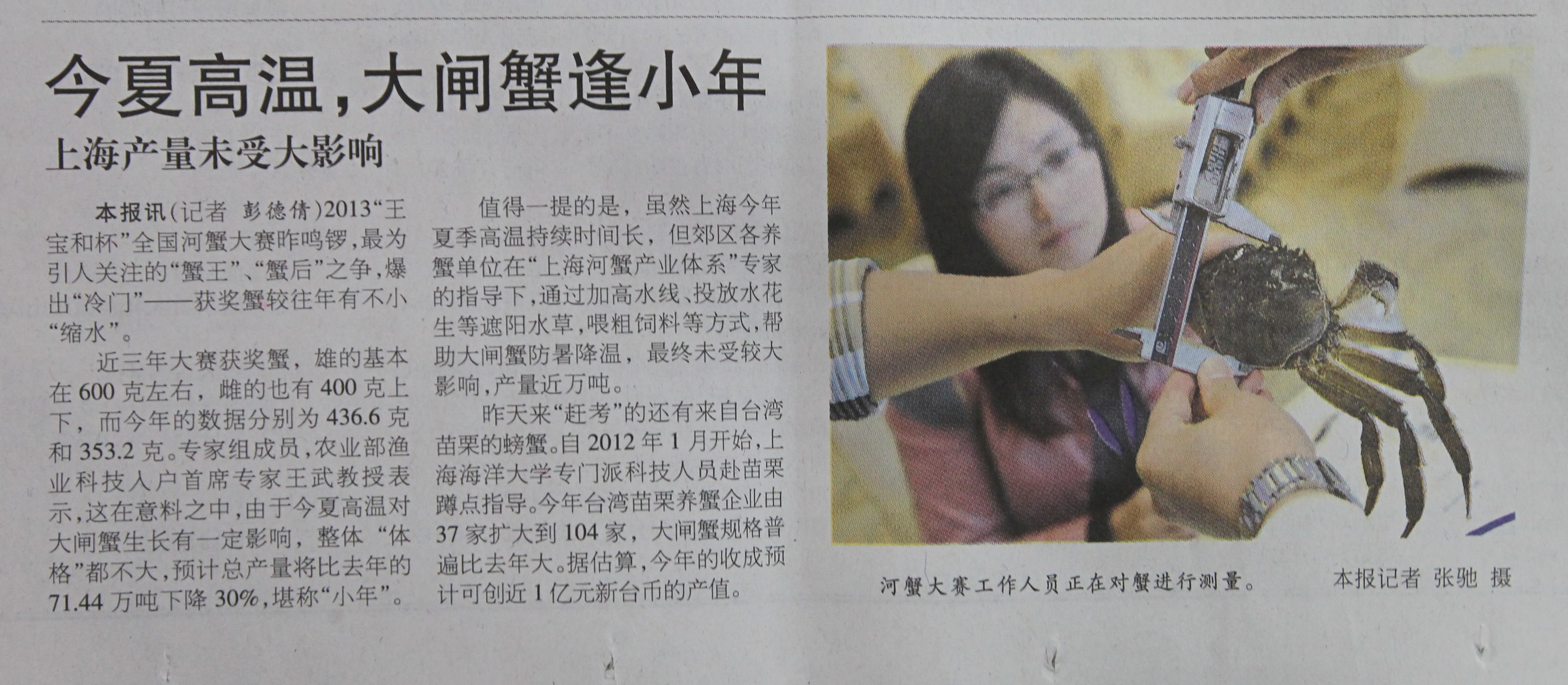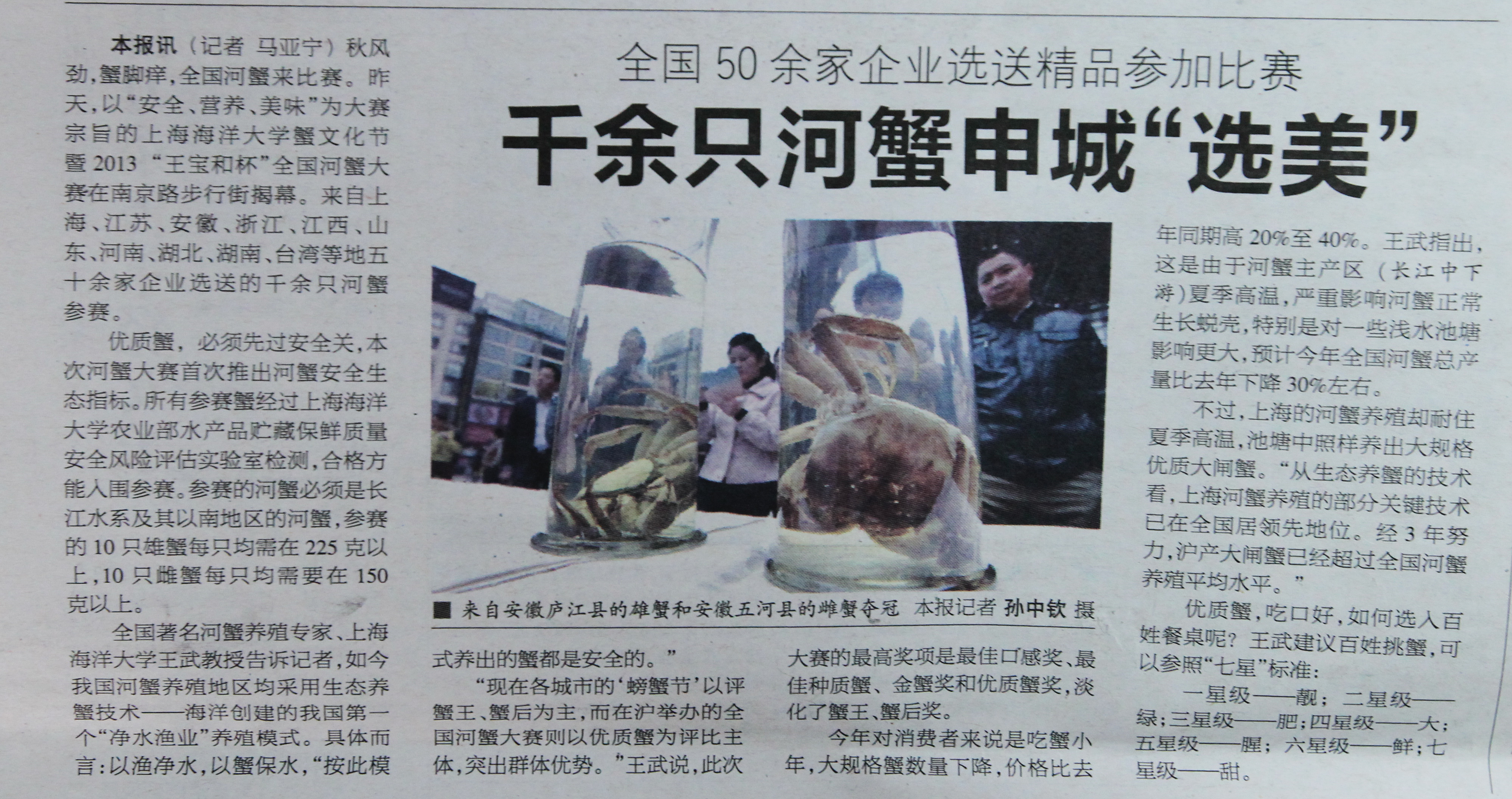 “今年我校举办的第七届全国河蟹大赛,所展评的河蟹,其规模之大、参加单位之多,覆盖面之广(上海、江苏、安徽、浙江、江西、山东、河南、湖北、湖南、台湾),这在国内还是第一次”。面对2013年“王宝和”杯全国河蟹大赛在上海南京路的成功举办,王武教授的欣喜之情溢于言表。