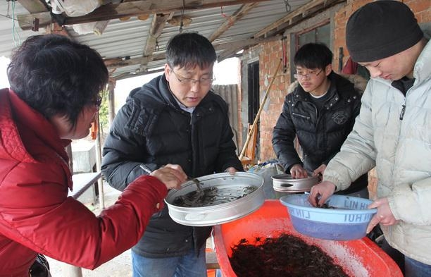 成永旭教授(左二)在崇明竖新镇东新村的“专供台湾”大闸蟹育苗基地