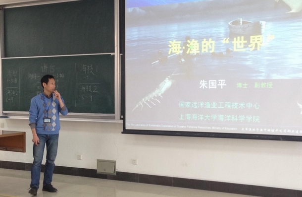 2013年11月19日下午,海洋科学学院朱国平副教授在1103教室为海洋科学学院全体2013级新生做了一场以“海·渔的世界”为主题的极地讲座。旨在通过朱教授个人南北极科考经历的介绍,让同学们对极地渔业资源有初步的了解,增加学生研究极地生态学的兴趣。