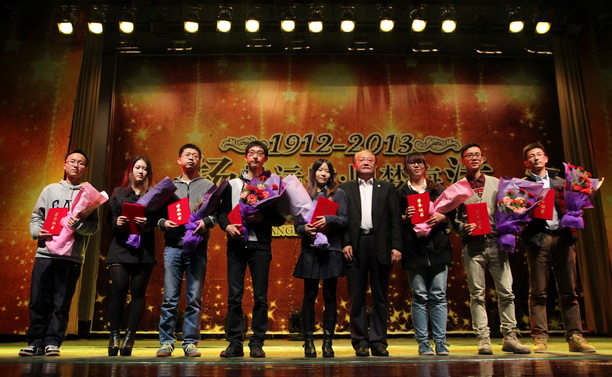 晚会以“壮·海大志”、“聚·青春情”、“筑·中国梦”三个篇章展开。一曲清亮动听的女生独唱《我有一个梦》,抒发了学生对梦想的追求;音诗画朗诵《中国梦 海大梦 我们的梦》回顾了过去百年海大人搏浪天涯的气概与自豪,也喊出了每个海大人肩负的历史使命。晚会中校长潘迎捷、校党委副书记汪歙萍分别为2013年获奖学生代表颁奖。本科生代表陈天一、童雨舟和研究生代表潘海、王浩分别接受了采访,分享了他们在刻苦学习、社会实践、创新创业等方面的经验。我校第一位全国大学生英语竞赛专业组一等奖获得者、外国语学院的陈天一在分享了她战胜来自复旦、交大、上外的学子获得上海市大学生双语演讲决赛的总冠军的经历,一句“只要肯努力付出,我们一点也不比985高校的学生差,让我们一起用出色的成绩为母校献礼!”赢得满场的喝彩和掌声。