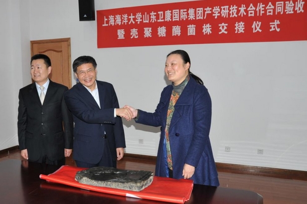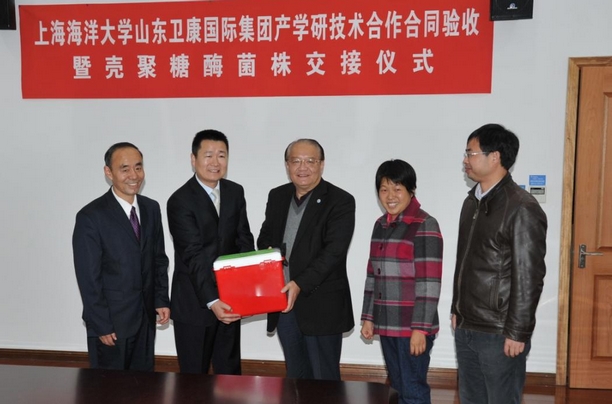 2013年11月26日,由我校与山东卫康国际集团的产学研技术合作项目“壳聚糖酶的工业化发酵生产研究”验收暨壳寡糖酶生产菌株交接仪式在校图文信息中心101室举行。我校潘迎捷校长、谢晶处长出席了项目验收暨菌株交接仪式。山东省临沂市国家级高新技术产业开发区管委会朱烨副主任、山东省临沂市国家级高新技术产业开发区科技局李瑞学副局长、山东卫康国际集团王宗继董事长参加了会议。会议由食品学院党委书记陈江华主持。