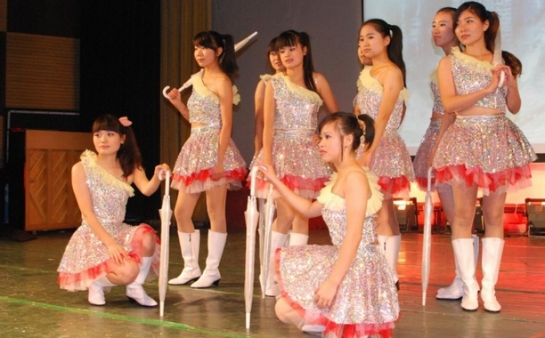 外邀嘉宾evolution乐团的摇滚歌曲为本次晚会拉开了序幕,主唱天籁的歌喉和伴奏的激情演奏,瞬间吸引了大家的视听觉,激情震翻全场。在余韵未止之时,《红遍全球》啦啦操闪亮登场,动感十足。