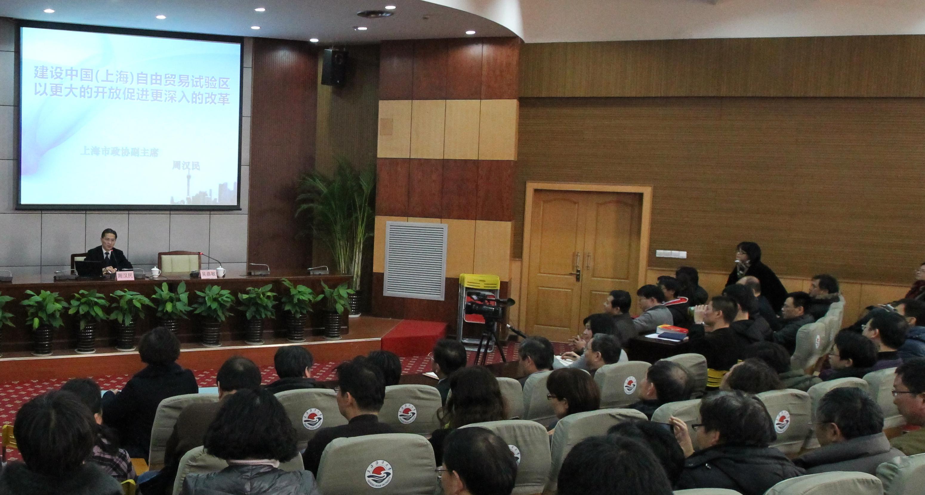 周汉民教授以《建设中国(上海)自由贸易试验区——以更大的开放促进更深入的改革》为题,从他曾在改革开放前沿阵地——浦东新区工作的亲身经历开始,向与会者详细阐述了设立中国(上海)自由贸易试验区的重要意义,以及建设中国(上海)自贸区的时代背景、功能定位、区域构成、建设目标等。他指出,中国(上海)自由贸易试验区是以更大的开放促进更深入地改革,是中国改革开放第四波浪潮的开始。建设中国(上海)自贸区要实现可复制、可推广,打造升级版,要实现改革突显、谈判突破、政策突围,力争发挥示范带动、服务全国的积极作用。整个报告过程中,他以丰富的专业知识、详实的数据为支撑,穿插着幽默风趣的比喻,为与会者上了生动的一课,现场反响热烈,大家都认为是一堂生动的形势教育和专业课程,对地处自贸区的我校新百年的建设和发展具有重要的现实意义和深远意义。