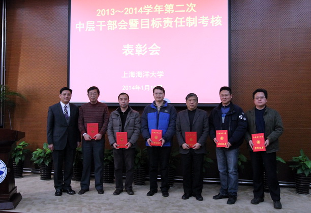 校党委副书记何雅主持2013年目标责任制考核表彰会。校党委书记吴嘉敏宣布考核结果和2013年度中层干部考核优秀名单,并为综合奖获奖学院(部)颁奖;校长程裕东为获奖的机关、直属部门和获得教学工作前三名学院颁奖;黄硕琳副校长为获得学科与人才队伍建设工作前三名学院颁奖;汪歙萍副书记为获得学生工作前三名学院颁奖;封金章副校长为获得党建、精神文明、廉政建设和管理工作前三名学院颁奖。根据考核结果,食品学院获2013年度目标责任制考核一等奖,捧得“金鸥杯”,同时获得教学工作第一名,捧得一个“银鸥杯”。水产与生命学院获得学科与人才队伍建设工作第一名,信息学院获得学生工作第一名,海洋科学学院获得党建、精神文明、廉政建设和管理工作第一名,分别捧得“银鸥杯”。财务与资产管理处等6个部门获机关、直属部门目标责任制考核一等奖,科技处等7个部门获二等奖。