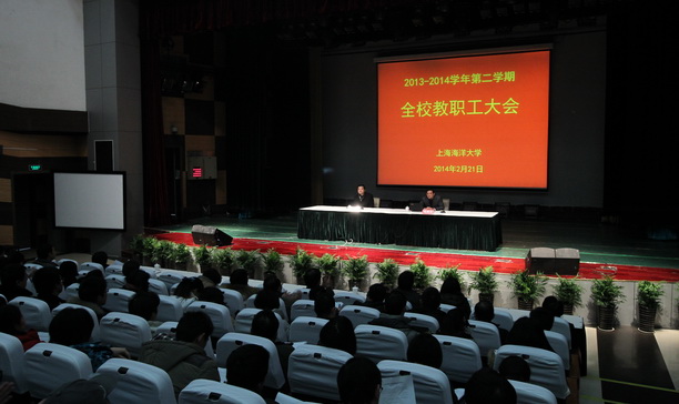 程裕东校长作了题为《转型发展、提高质量、改革创新,努力提升高水平特色大学内涵建设水平》的报告。程校长从认真组织开展党的群众路线教育实践活动、深入推进教育教学改革、扎实推进学科平台建设、深化人事制度改革、加强国际合作与交流、不断完善校区功能、加强平安校园建设等六个方面回顾了2013年学校的各项工作,在学校“十二五”建设目标框架下,分析了学校的发展现状和面临的形势。并结合当前形势,传达了高等教育改革和上海市有关改革精神,提出要认真贯彻落实十八届三中全会精神,全面落实党的群众路线教育实践活动和市委巡视整改方案,以学科、专业、学位点一体化建设为主线,以师资队伍建设为根本,以科学管理运行为基础,稳步推进内涵建设,实现学校各项事业科学发展。程校长从“凝心聚力抓学科建设质量”、“坚持不懈抓人才培养质量”、“继续强化师资队伍建设质量”、“更加注重抓科学管理质量”四个方面布置了2014年重点工作,希望全体教职工以更加奋发有为的精神状态,全面落实好2014年度工作计划,为实现“十二五”规划目标而努力奋斗。