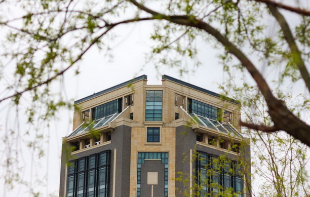 第三教学楼前人工湖里的鱼儿自由自在地畅游。被铁栅栏围起的梨花树,花开满园,蓝天,交相辉映,在阳光下出落成一道闪亮的风景线。沿着林荫小道向前走去,处处绿意盎然,草长莺飞。路旁桃花正艳,清风袭来,片片桃花花瓣随风乱舞,不多时,石板地上已是嫣红点点,零星残红,风姿犹存,竟让人不忍踏上去。