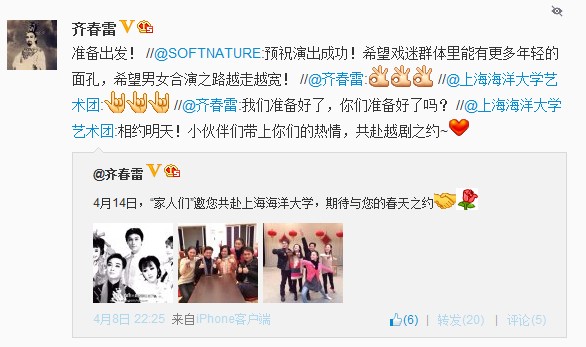 上海海洋大学学生艺术团官方微博中也有很多观众互动,对学校弘扬中华优秀传统文化,培养学生艺术情操的工作予以肯定。