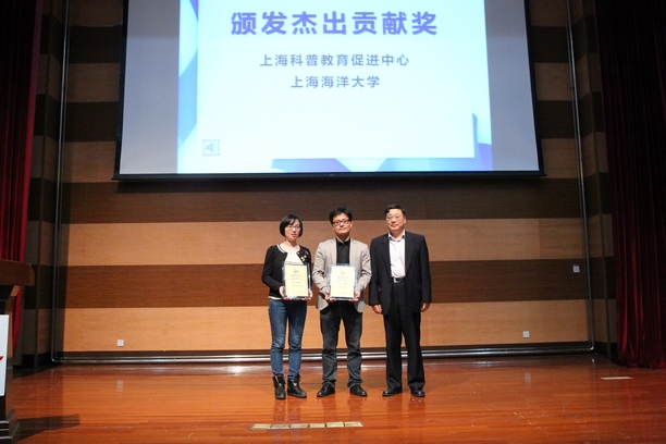 上海科技馆基金处副处长陈筠、上海科普教育促进中心副主任凤慧娟为东华大学、复旦大学等学校颁发优秀组织奖;获得特等奖、一等奖、二等奖的团队代表也陆续上台领取获奖证书;上海科普促进教育中心及上海海洋大学获得杰出贡献奖。