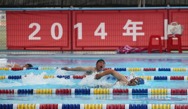 7月3日,2014年上海海洋大学游泳比赛在游泳馆举行。来自全校各单位的近百余名游泳运动员在泳池里劈波斩浪,一决高低。副校长、校体育运动委员会主任吴建农、以及体育部、工会、学生处负责人出席开幕式并观看比赛。