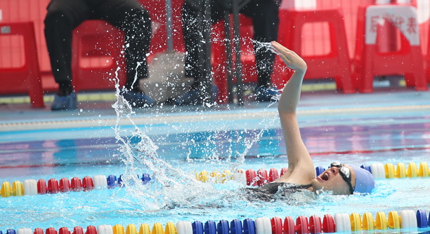 在游泳池里,学生男子50米自由泳项目第一个鸣枪开赛,随后,女子50米、男子接力等项目轮番上演,泳池里水花翻滚,参赛选手们犹如碧波蛟龙,奋勇争先。