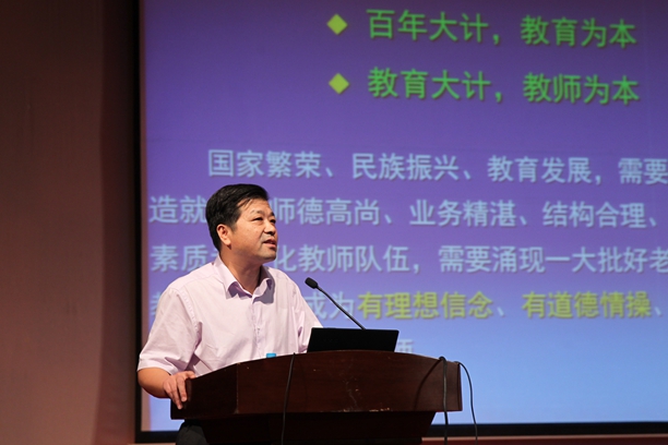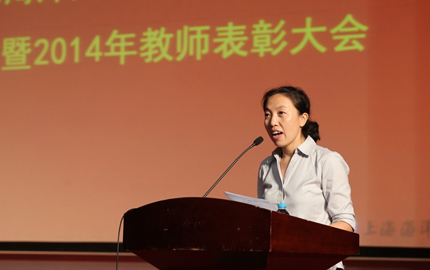 校党委副书记汪歙萍指出,学校要认真贯彻习近平总书记在北师大教师代表座谈会上的讲话精神,采取切实有力措施不断完善体制机制,营造优秀教师不断涌现的良好教育氛围,引导支持广大教师带头践行社会主义核心价值观,努力建设高素质的一流教师队伍,争做党和人民满意的好老师。校党委副书记何雅宣读了表彰决定,对过去一年来我校教职工涌现出的先进典型、获奖教师、集体代表予以表彰。一年来,在教书育人、科学研究、管理服务方面获奖教师代表上台接受学生献花。崔维成老师、齐珮老师作为教师代表,结合自身工作实际作了发言,表达了立足岗位,锐意进取,为建设高水平特色大学贡献力量的决心。