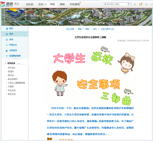 本次易班迎新,时刻关注着新生的动态,提前为报道、军训期间可能有的安全隐患作出提醒,防患于未然。针对近期媒体报道女大学生受侵害事件和往年易发的偷盗案件,易班精心制作了“大学生返校安全注意事项三部曲”、“亲,你今天防盗防骗了吗?”等系列主题教育帖,并及时将教务处和武装部等与学生息息相关的信息发布。如“2014级新生大学英语测试考场早知道”、“2014-2015秋学期在线课程开课通知”、“军训,你准备好了吗”等等,这些主题帖都图文并茂、融入95后学生喜欢的元素,受到学生欢迎,浏览量超过3万。