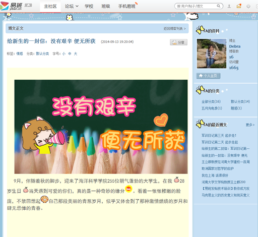 作为网络互动社区,易班工作站每个人都是社区的建设者、维护者。易班工作者希望通过创新服务方式,提升服务育人效果。身为学长、学姐的同学不仅及时解答新生提问,用他们独特色视角发起话题、上传图片和精心制作贴文,受到了广泛好评。网友“wangjie511324”在留言中点赞道“帖子做得好棒啊”;二是引导辅导员利用易班与学生网上谈心交流;开学之际,辅导员结合工作实际撰写了不少主题博文,与学生开展不受时空限制的互动交流。海洋学院新生辅导员高晓丽在博文《给新生的一封信:没有艰辛 便无所获》中深情地写道“在我28岁生日当天遇到可爱的你们,真的是一种奇妙的缘分”,她从哈佛大学的校训出发,分享了大学学习生活的经验,激励新生珍惜大学时光、保持进取心态、努力拼搏上进,得到了将近200位学生的共鸣和好评。她还结合新生军训连写三篇《军训日记》,同样收获了众多新生的点赞。