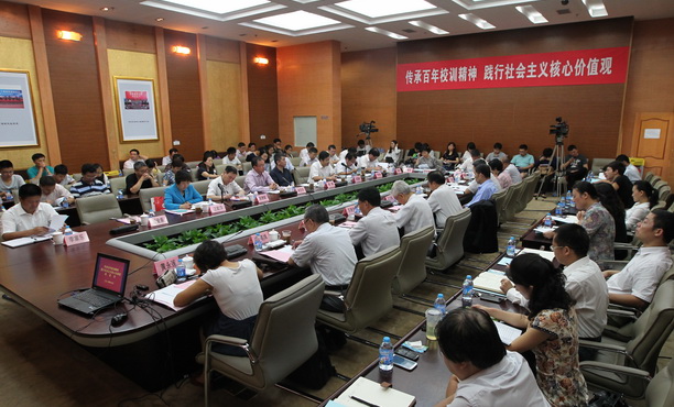 时值校训“勤朴忠实”提出100周年之际,2014年9月28日,“传承百年校训精神,践行核心价值观”座谈会在上海海洋大学顺利召开。座谈会结合纪念孔子诞辰2565周年与百年校训提出100周年,围绕培育和践行社会主义核心价值观、继承和弘扬中国传统文化、挖掘和传承校训精神,以“讲认识、讲故事、践行动、讲梦想”的形式,立足如何“落细、落小、落实”核心价值观,邀请各界代表进行座谈,同时启动系列主题教育活动。教育部思政司副巡视员俞亚东,上海市委宣传部副部长、市精神文明办公室主任燕爽,市教卫工作党委副书记、市教委副主任高德毅,中央马克思主义理论研究和建设工程首席专家、清华大学高校德育研究中心副主任吴潜涛教授及校领导吴嘉敏、汪歙萍、黄硕琳、封金章、吴建农与师生代表百余人出席会议。文汇报、新民晚报、新华社、光明日报、上海电视台、上海教育电视台、上海人民广播电台、东方早报等十余家媒体记者到会报道。座谈会由校党委副书记汪歙萍主持。