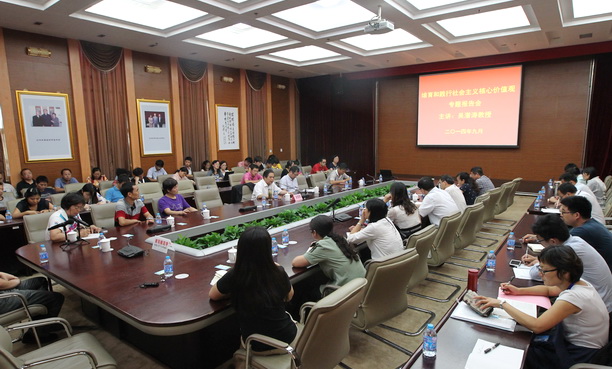 为传承百年校训精神,培育和践行社会主义核心价值观,2014年9月28日下午,中央马克思主义理论研究和建设工程首席专家、清华大学高校德育研究中心副主任吴潜涛教授应邀为我校师生作“社会主义核心价值观”专题报告。全体辅导员、元鼎学院学生、学生处和宣传部工作人员聆听了报告。