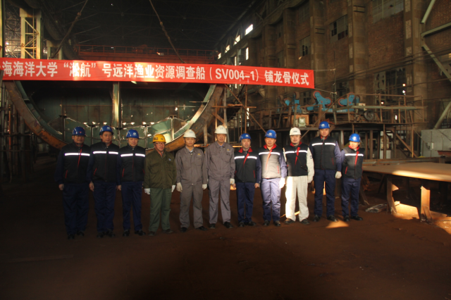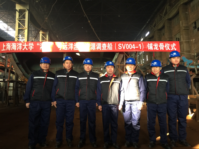 2015年12月28日上午10点29分,天津新港船舶重工有限责任公司200T车间,响起欢庆的炮竹声,“淞航”号(SV004-1)102分段铺龙骨仪式如期举行。天津船检周亚新处长、天津新港特船厂王喜文厂长、信玉柱书记、上海双希海事发展有限公司现场总监刘新文、我校船建办常务副主任姜新耀及监造组全体人员和SV004-1工程102分段的建造工人出席仪式。天气虽然寒冷,但出席铺龙骨仪式的领导和工作人员却心情激动,特别兴奋。经过现场检验,船检、船厂、监理和船东代表分别在铺龙骨仪式认可单上签字。