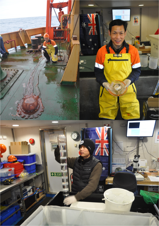 本次调查于2016年1月11日由澳大利亚极地门户——霍巴特出发,海上调查预计为期2个月,此外还需为澳大利亚南极莫森站(Mawson Station)和戴维斯站(Davis Station)提供补给。调查内容涵盖9个方面,分别为原生动物与初级生产力、声学调查、浮游动物、磷虾、中上层鱼类、生物地球化学与微量元素、海洋学、基因与同位素分析和海洋哺乳动物与鸟类等。朱国平副教授主要从事南极鱼类的分类、基础生物学及种群分布以及磷虾生物学等方面的工作,具体体现在四个方面:(1)与澳大利亚南极局首席科学家、我校客座教授So Kawaguchi博士合作,共同解决南大洋印度洋扇区南极磷虾寄生虫(真簇线虫)的时空分布,并由此探究南大洋气候变化对海洋生态系统的影响;(2)与塔斯马尼亚大学海洋与极地研究所Kerrie Swadling教授及So Kawaguchi博士合作,研究南极印度洋扇区南极磷虾的摄食特性,并进一步比较印度洋扇区和大西洋扇区南极磷虾食性差异;(3)与AAD(AndrewConstable等)、南极门户(Andrea Walters博士等)、IMAS(Sophie Bestley博士等)及ACE-CRC(Rowan Trebilco博士等)的科学家合作,共同解决南极印度洋扇区鱼类资源时空分布特征及其食物网结构;(4)南极鱼类,尤其是南极电灯鱼耳石研究,并进一步推动基于耳石微化学技术的极地生物海洋学研究。在此过程中,朱国平副教授还在澳大利亚南极磷虾专家Rob King博士的帮助下,开展了南极磷虾暂养以及瞬时生长率的研究,并取得了大量的一手资料和数据。