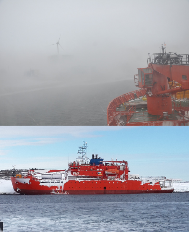 暴风雪中的莫森站与南极星号(上)及搁浅后的南极星号(下)