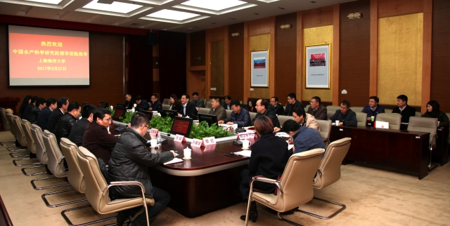 2月27日,中国水产科学研究院院长崔利锋、副院长邓伟,研究院东海水产研究所党委书记庄平、渔业机械仪器研究所党委书记刘忠松等一行到上海海洋大学进行调研交流。校长程裕东、副校长李家乐,机关相关职能部门、学院代表等出席座谈会。