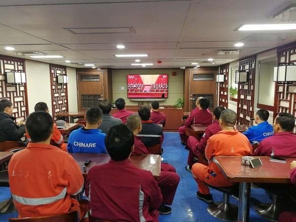 图说:远洋渔业资源调查船“淞航”号全体人员收看大会实况