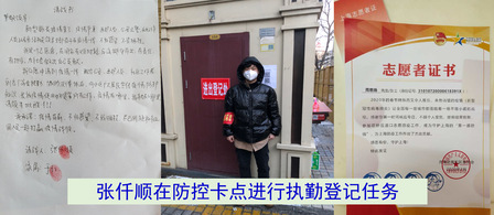 食品学院2019级食研3班颜旭的家乡济宁市兖州区疫情爆发后开始陆续封闭社区和街道,对道路通行进行严格管控。颜旭参加了山东省济宁市兖州区飞龙社区的志愿服务工作,给进出人员测量体温、登记,宣传疫情注意事项,分发防疫知识宣传单,在人员进出的地方循环播放防疫知识。随着各单位复工复产,防疫压力渐渐增大,按照上级要求,志愿者们将之前简易通行证换成上班通勤证和日常居民证两种,为居民做了详细的登记和发放工作。