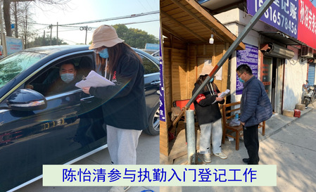 “您好,请出示您的出入证!”“您好,请配合登记信息!谢谢!”工作岗位上的她对进出社区人员进行体温检测,一丝不苟地对入社区的人员实施身份证登记,积极向进出社区的人员宣传疫情防控知识。“一天需站岗六个小时,虽然身体有些疲累,但能够服务于人民、确保社区安全让我觉得一切都是值得的,”陈怡清表示,“疫情防控基础在社区,社区工作者们奋战在抗击病毒的最前线,用他们的脚丈量出每一份精准数据,用他们的手敲开每一扇紧闭的心门,为辖区百姓筑起一道道生命防线。我有幸加入社区志愿者队伍,就要抓住这次宝贵的机会,发出自己的光和热照亮人民群众,保障他们的安全。这是我的职责所在!同时我也向所有奋战在防控疫情一线的人员致以崇高的敬意!我相信,14亿颗心定能构筑起坚不可摧的人民防线。”