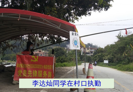 海洋科学学院2017海技2班的李达灿家住广西南宁市良庆区南晓镇派双村,在此次疫情期间他积极响应号召,参加了广西壮族自治区南宁市良庆区南晓镇派双村的防疫志愿活动,每周按时到达村口防疫卡点执勤,控制人员进出,严格要求外来人员扫码登记,疫情高峰期更是严格禁止外来车辆入村,为全体村民把好关。作为村里为数不多的年轻大学生,作为入党积极分子,他深知自己的责任与担当,积极做好乡村防疫工作,打好防疫阻击战,为国家和人民奉献自己的力量。