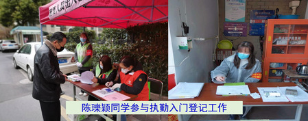 海洋文化与法律学院2017级行政管理1班陈瓅颖是班级学习委员。她说:“近期,上海保持新增确诊病例为0的天数越来越多,治愈出院者也越来越多,一切都在往好的方向发展!但越是疫情防控进入关键期,越是不能放松警惕,坚持不松懈、不麻痹、不侥幸,越要科学研判形势、优化防控策略。随着节后大量人员返程、大批企业陆续复工、外来人员数量增多,上海正处在疫情防控的关键阶段,正需要更多的社会力量,作为青年的我们应该要打头阵,为防控疫情贡献自己的一份力,自己的家园要用自己的双手来守护。”她所做的志愿服务工作主要包括:协助工作人员开展小区租赁人员出入证办理,尤其是外籍租赁人员更要做好个人旅行史的记录。并管理排队秩序,让人和人之间间隔一米,保证安全。严查访客个人信息以及外来车辆,未隔离满14天的外地来沪人员,一律不准进入小区。管理门口的快递服务站,告知快递人员将快递放到指定区域。遇到外卖人员,及时通知居民到小区门口领取对进入小区的居民进行出入证检查,并测量体温。