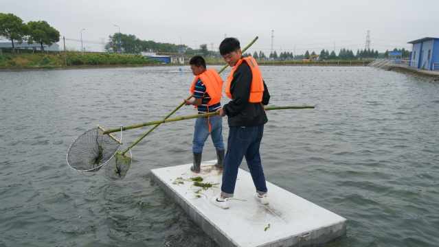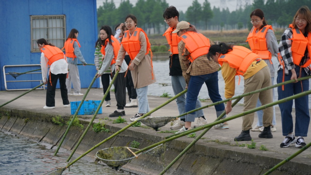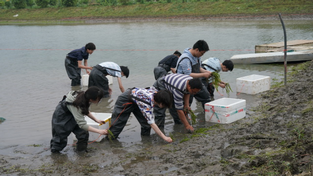 揭牌仪式后,在学校相关专业教师和基地带教人员的指导下,学生分组参加了“捞水草”和“种水草”两项劳动。