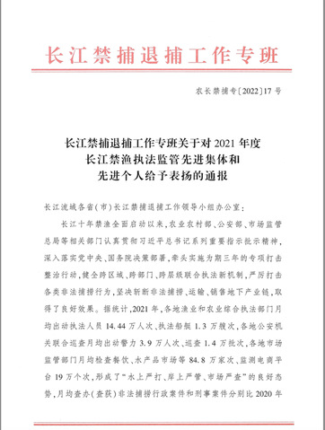 近日,学校收到长江禁捕退捕工作专班关于《对2021年长江禁渔执法监督先进集体和先进个人给予表扬的通报》,海洋文化与法律学院教师张燕雪丹、信息学院教师黄幸幸荣获先进个人称号,长江水域生态保护战略研究中心荣获先进集体称号。