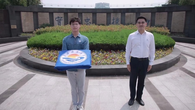 上海海洋大学党委书记王宏舟在校训墙前,将校旗传递给毕业生代表,希冀毕业生秉承“勤朴忠实”的校训,带着母校的殷殷期望,将无数祝愿化为行动,不断前行。
