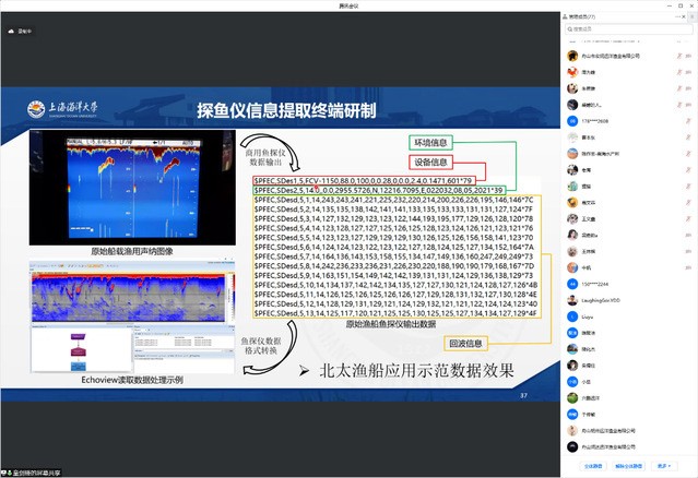 6月29日下午,远洋生物资源立体探测与渔场解析技术项目组通过网络会议的形式,组织有关专家,面向远洋渔业企业和相关科研院所推介项目重要成果之一,商用探鱼仪信息提取终端研发与远洋渔场声学探测技术,推介会由项目负责人上海海洋大学海洋科学学院陈新军教授主持。