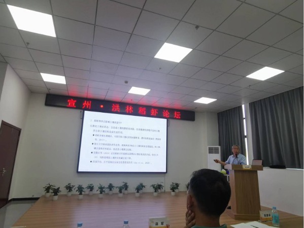 6月9日下午,主办方在洪林现代农业示范区管委会举办了宣州·洪林·稻虾论坛,上海海洋大学代表团应邀出席,成永旭发表了“稻渔种养的饲料精准投喂”主旨演讲,对稻田小龙虾养殖的配合饲料和精准投喂进行介绍,博士后张冬冬作了“上海海洋大学洪林科研中心的研究进展未来计划”的分享,特别介绍了“小龙虾+水稻+罗氏沼虾”、“小龙虾+水稻+1龄早熟蟹”和“再生稻+小龙虾”模式的关键技术与操作规程。