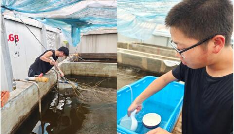 炎炎夏日,常常伴着夜色,凌晨12点到1点还要奔赴车间给虾投喂饲料。“我们经常干着衣服进去,湿着衣服出来。”科技小院的程曦一边拧干衣服上的汗水,一边说道。