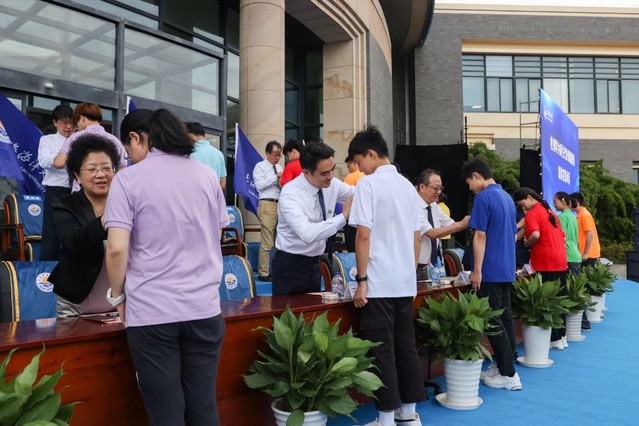 开学典礼上举行了校徽佩戴仪式,学校领导为新生代表佩戴校徽。所有同学在校学生会执行主席陈泽楠的带领下集体宣誓承诺。