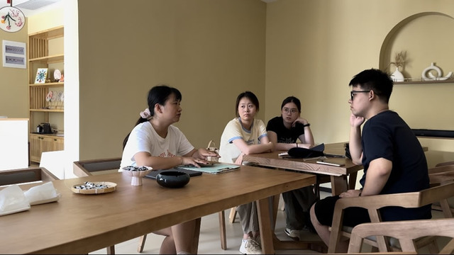 为深究“两山”理念成功践行的背后原因,探索可复制的可持续生态文明建设之路,团队成员在余村党群中心采访了村委委员阮杰。从他的讲述中,成员们深入了解到为了改善环境同时又发展经济,余村党员先试先行带领发展,但过程并非一帆风顺。开始时村民们制作竹工艺品售卖,但过多的工艺厂也带来了环境污染。党员们想办法劝服村民,党员带头治理环境、建民宿、开办农家乐,带领村民逐渐走上绿色发展之路。现如今,余村形成特定的“余村”IP带动周围村庄共同发展,一步步走向“绿水青山就是金山银山”。