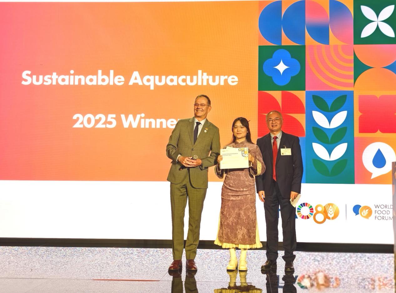 当地时间2025年10月14日下午,联合国粮农组织(FAO)主办的2025年度“世界粮食论坛转型研究挑战赛”(World Food Forum Transformative Research Challenge, TRC)在意大利罗马落下帷幕。上海海洋大学水产与生命学院博士研究生韩焕团队凭借“复合益生菌降碳除味技术”(Probiotics reduce greenhouse gas and off-flavor),从全球参赛团队中突围,斩获该赛事首次“可持续水产养殖奖”冠军。团队指导教师李慷与队长韩焕受邀赴FAO总部参加总决赛。